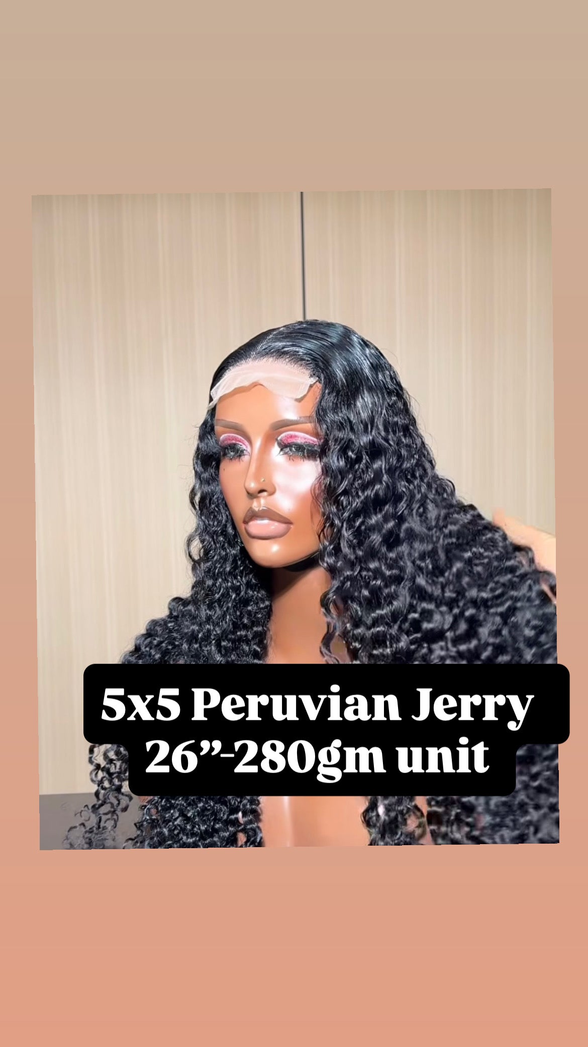 100% Peruvian Human hair wig cap made with 26” of tight coil Jerry curls. 5x5 Closure that gives that glueless look.
